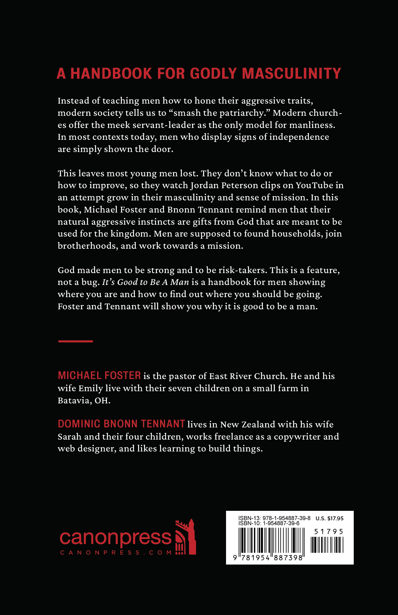 ""Hard times make real men. In an age when masculinity is attacked from every angle, leading to a generation at equal turns passive and belligerent, Michael Foster and Bnonn Tennant have given us a manifesto for manhood. This is a clarion call. It stands out all the more for the lack of such clear speech and precise biblical teaching in evangelical circles today. It's Good to Be a Man anchors men in the Word, in the grace of God, in the truth. This is one of the best books on manhood ever written, period." -Owen Strachan, Provost, Grace Bible Theological Seminary; author, Christianity and Wokeness and Reenchanting Humanity